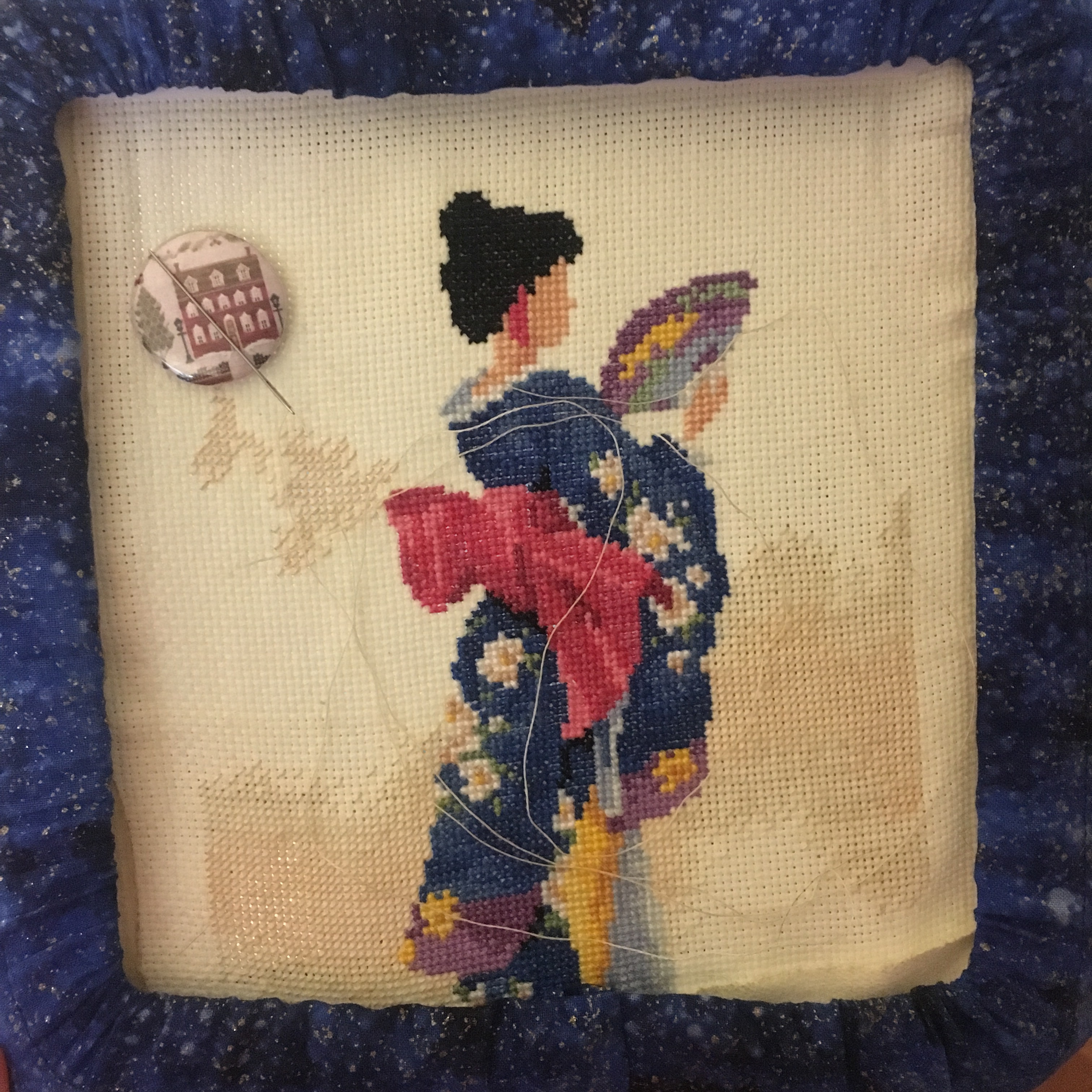 After finishing the March design, I spent some time working on my Geisha Girl pattern. It’s very hard to see the progress in the picture because I’m working on some background shading which is just a tad darker than the fabric, but here’s what she looks like anyway: